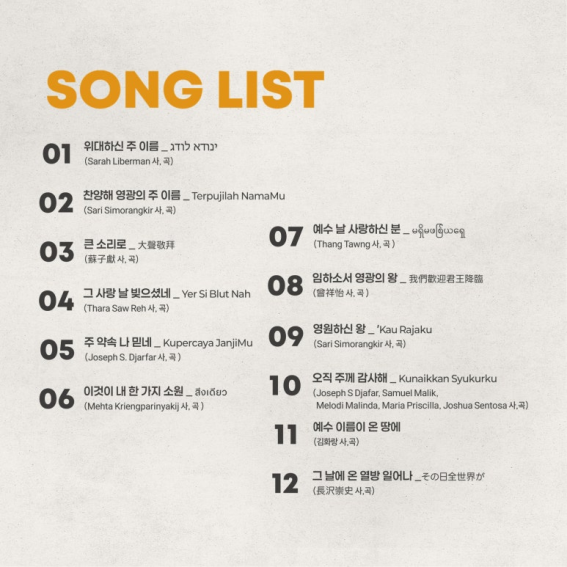 총 12곡의 다양한 나라와 민족의 예배곡이 수록된 이번 앨범에는 한국어 곡명과 함께 원곡의 언어와 문자로 곡명이 적혀있어 수록곡 정보에서도 열방의 노래 안에 담긴 하나님을 열방의 마음으로 품고 예배하고자 하는 앨범의 주제와 기획 의도를 보여줍니다.