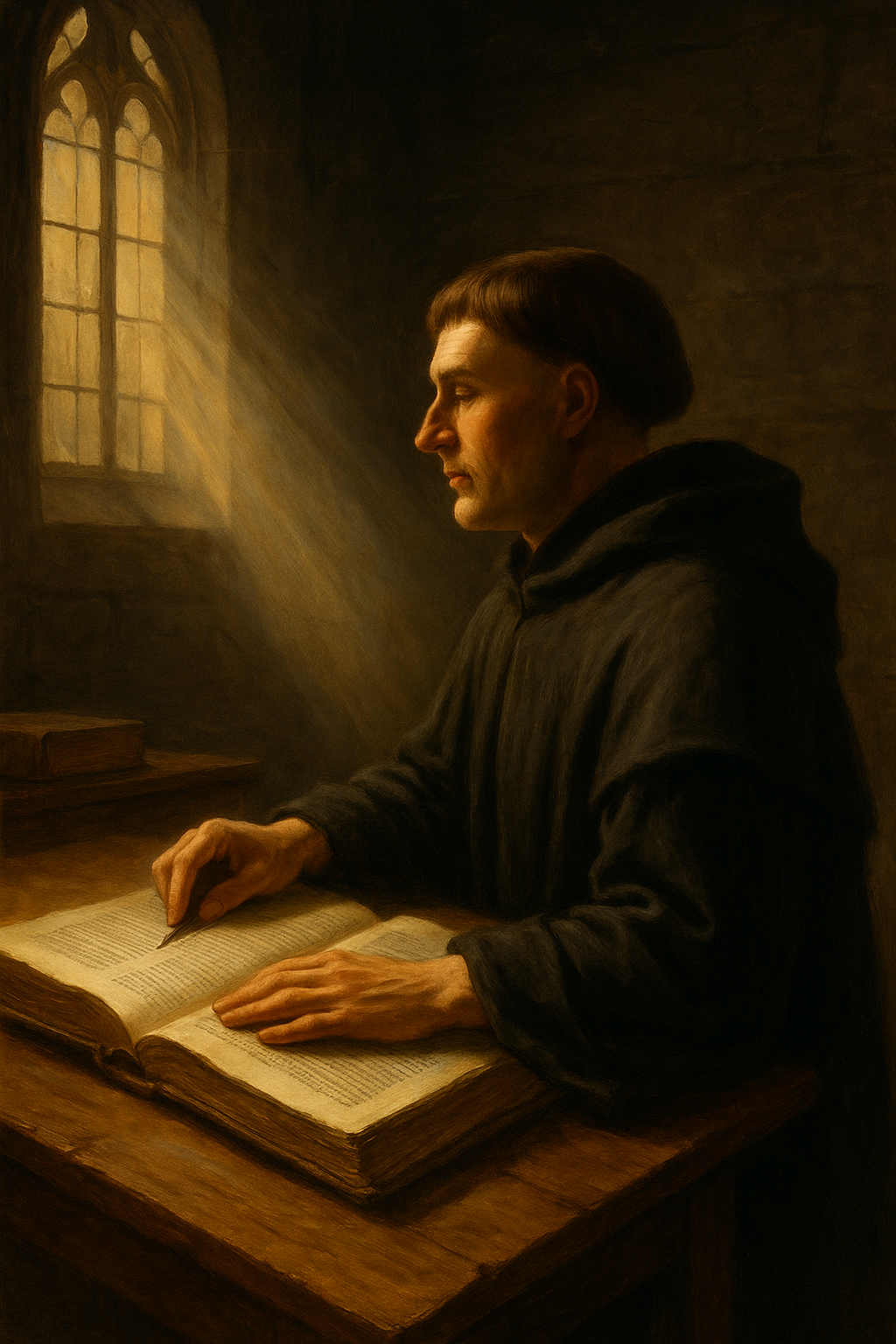 그리고 마침내 1515년, 비텐베르크 대학에서 로마서를 강의하던 중 그는 성경 속에서 새로운 진리를 발견한다. “의인은 믿음으로 말미암아 살리라(롬 1:17).” 그는 깨달았다. 하나님의 의란 인간이 이루는 것이 아니라, 하나님께서 믿는 자에게 값없이 주시는 은혜라는 것을. 그 순간 루터는 자신을 묶고 있던 행위의 사슬에서 해방되었다. 이 깨달음은 훗날 이신칭의(Justification by Faith), 곧 ‘믿음으로 말미암아 의롭게 됨’이라는 종교개혁의 기초가 된다.